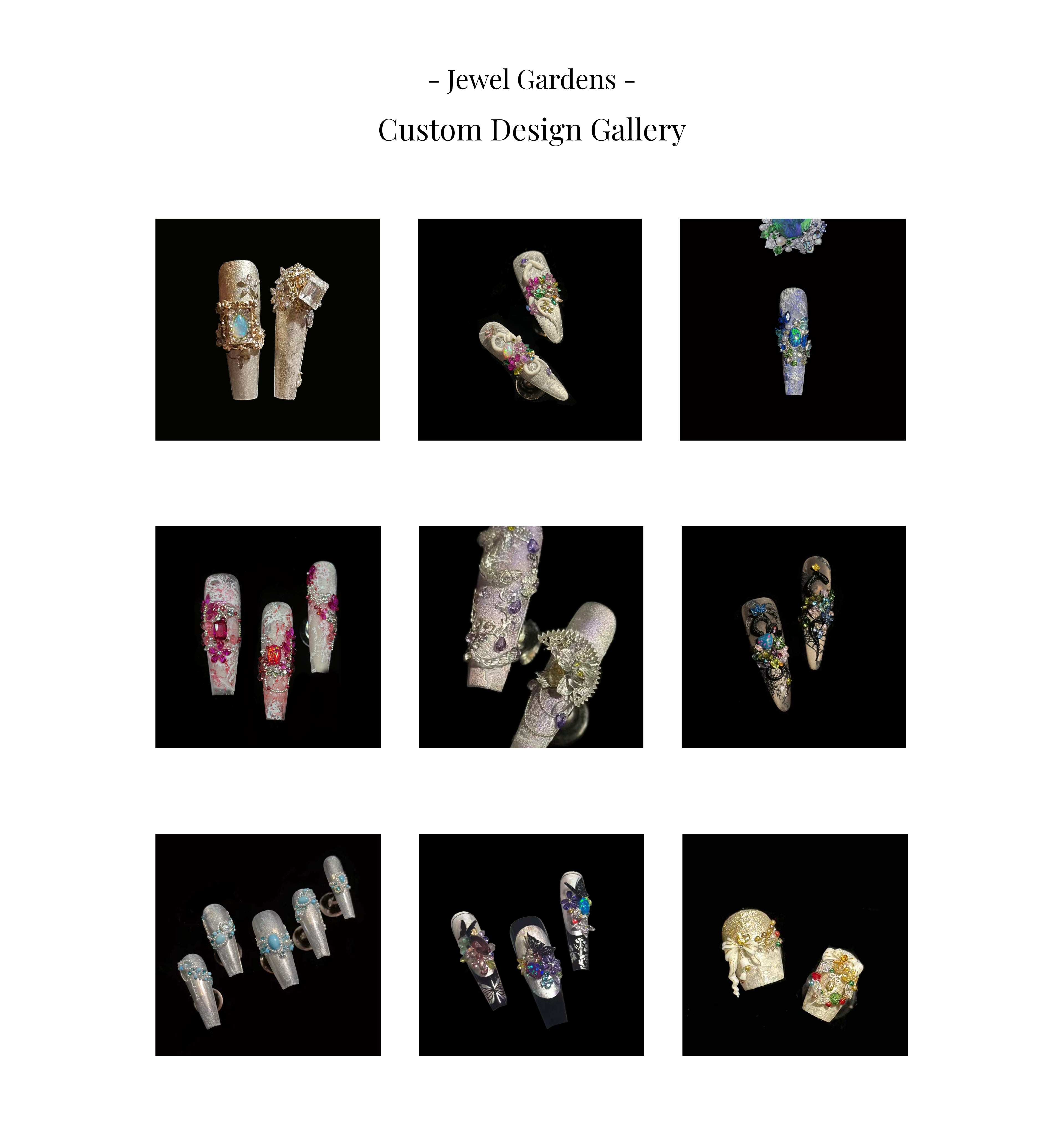 Our Jewel Garden Collection is more than a nail set—it’s a bespoke storytelling experience. Upload photos of your heirloom jewelry, engagement ring, or evening gown, and our designers will handcraft press-on nails that mirror their intricate details.