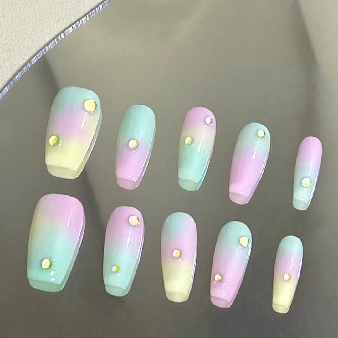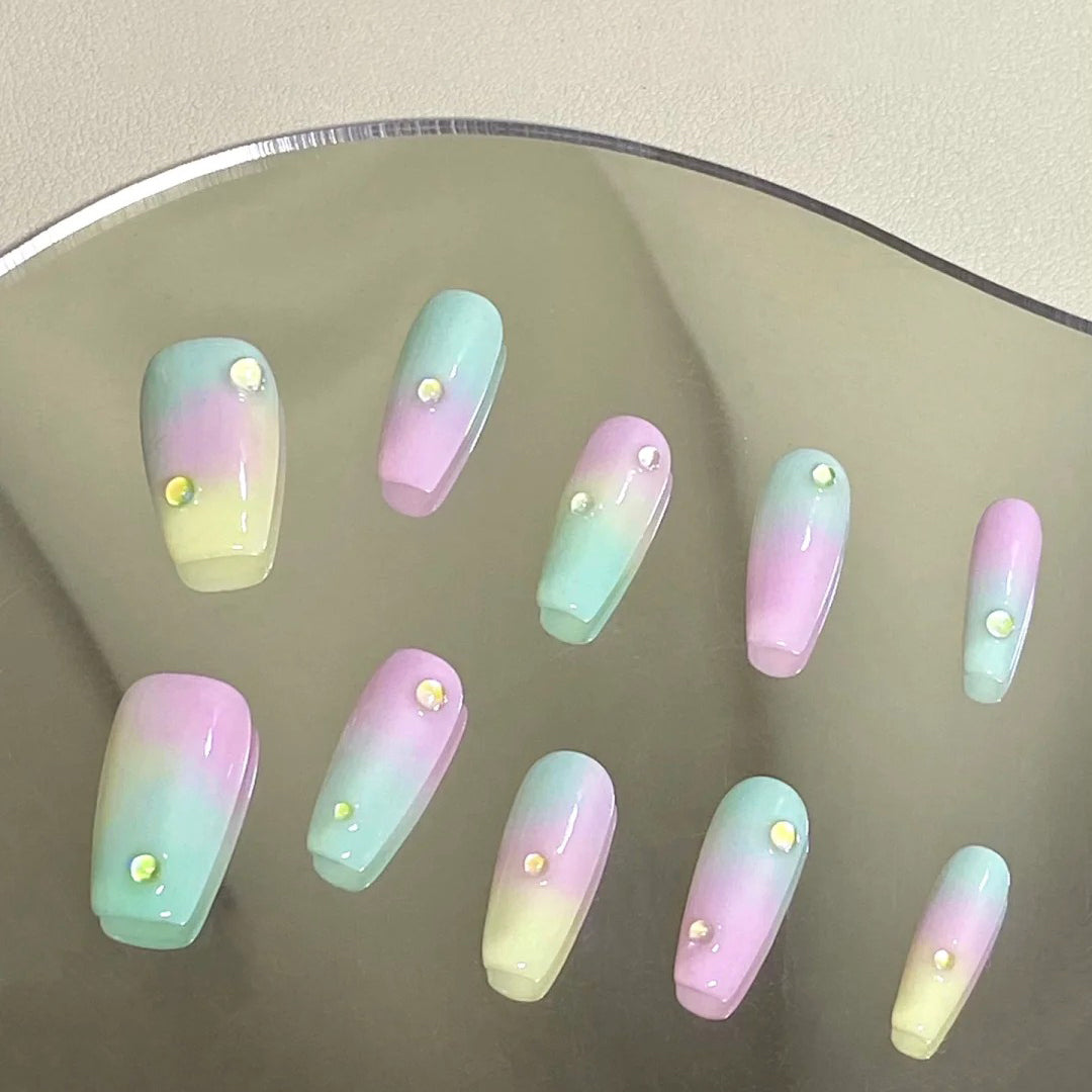 Press-on Set|Green-Pink Gradient × Crystal Accents (Ready-to-Wear)