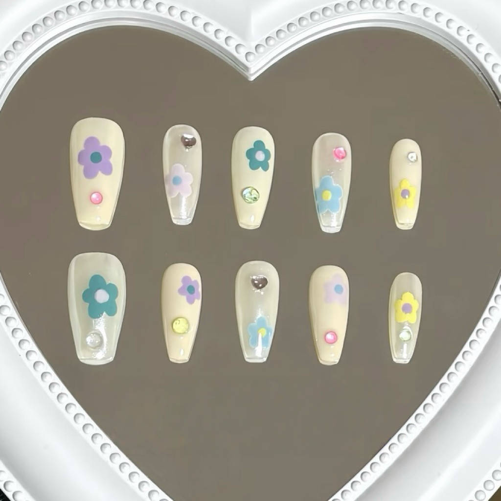 Design Story: A dewy garden on your fingertips, Bloom Dot mixes jelly-toned florals with soft shimmer. Each nail features translucent flowers in pastel tones, highlighted with rhinestone gems for a playful sparkle. Like morning dew on a sunny spring bloom, this set feels fresh, floral, and full of life.