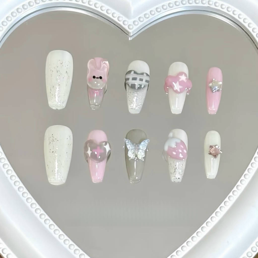 Design Story: A dreamy escape into soft clouds, plush toys, and sparkly wishes. Bunny Dream brings together creamy whites, baby pinks, and silvery glitters, adorned with 3D bunnies, puffy hearts, and butterfly wings. Each detail whispers whimsy and softness—like a lullaby turned wearable.