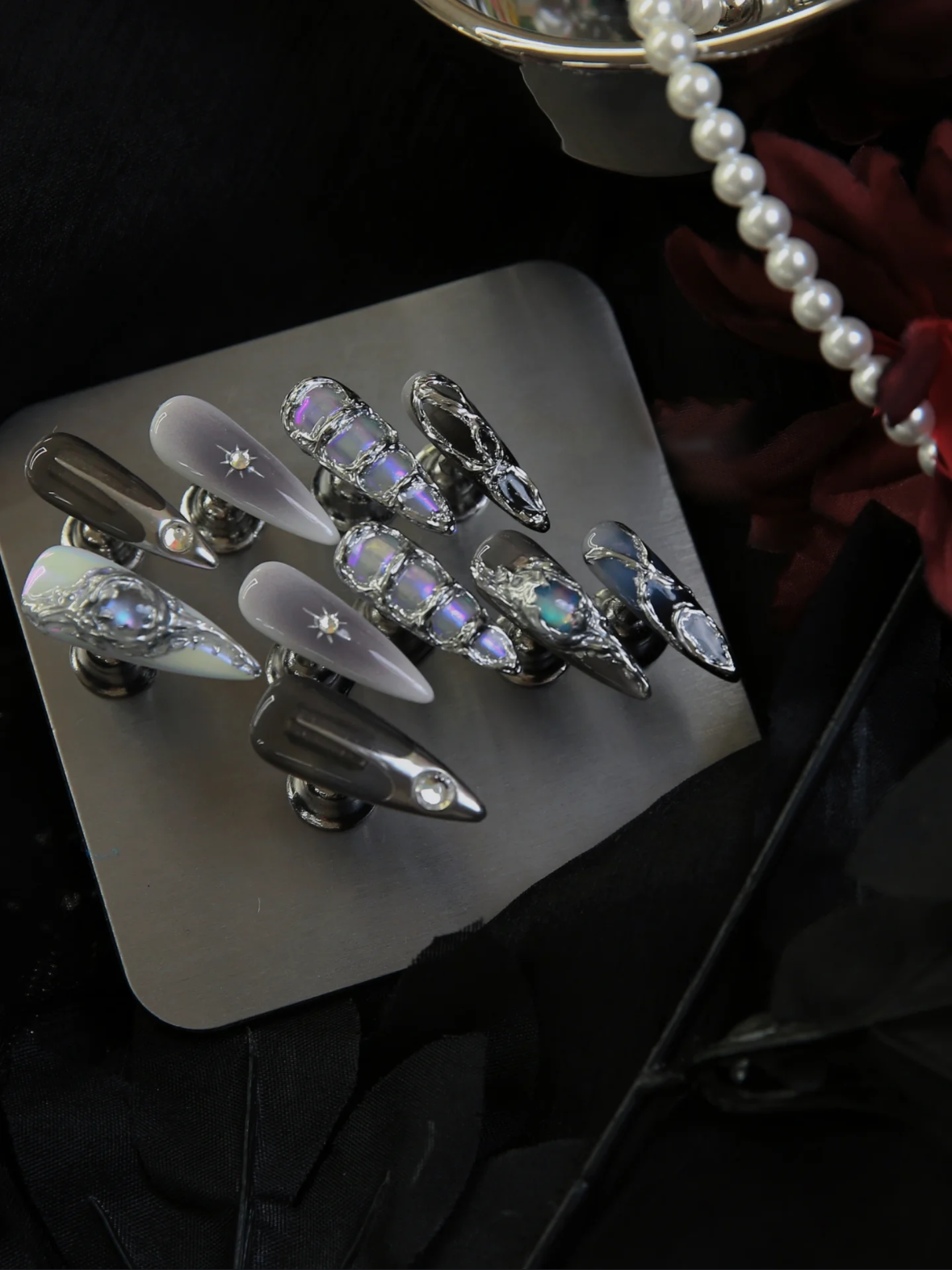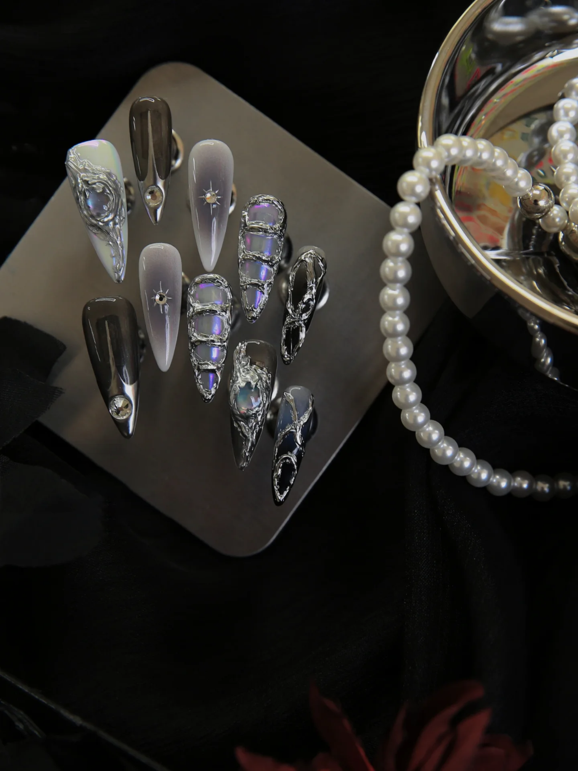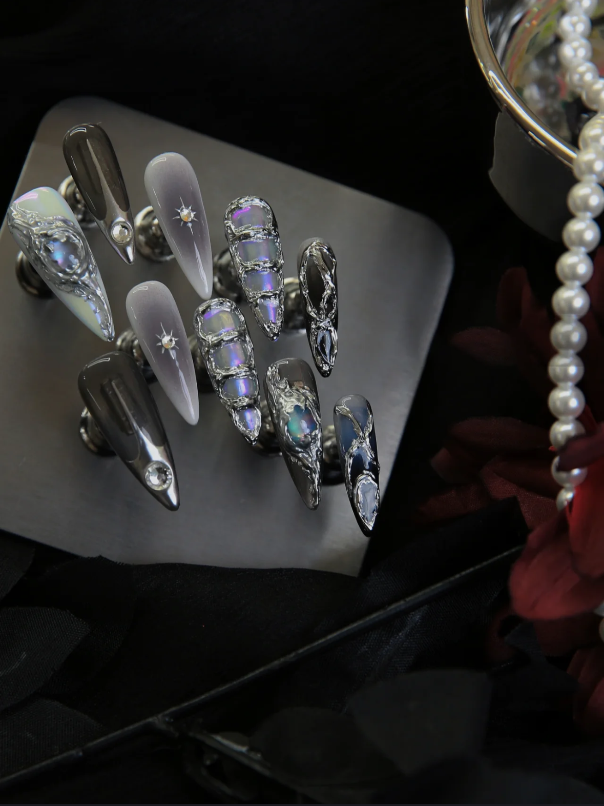 Design Concept: Inspired by interstellar armor and bio-metal aesthetics, this set features molten chrome textures fused with iridescent spinal-like segments and cosmic accents. From deep grey gradients to galactic orbs encased in liquid metal, each nail mirrors a relic of futuristic lifeforms.