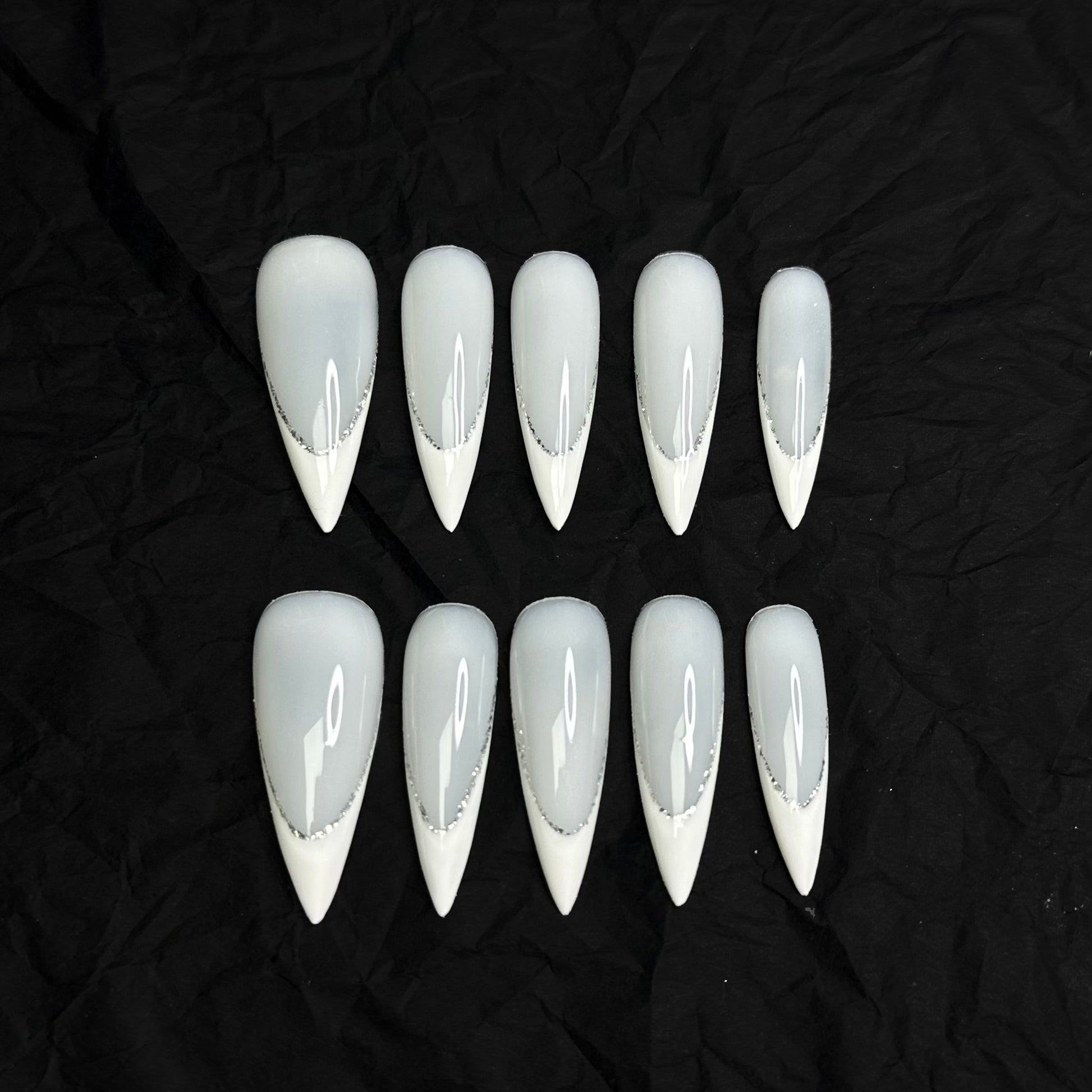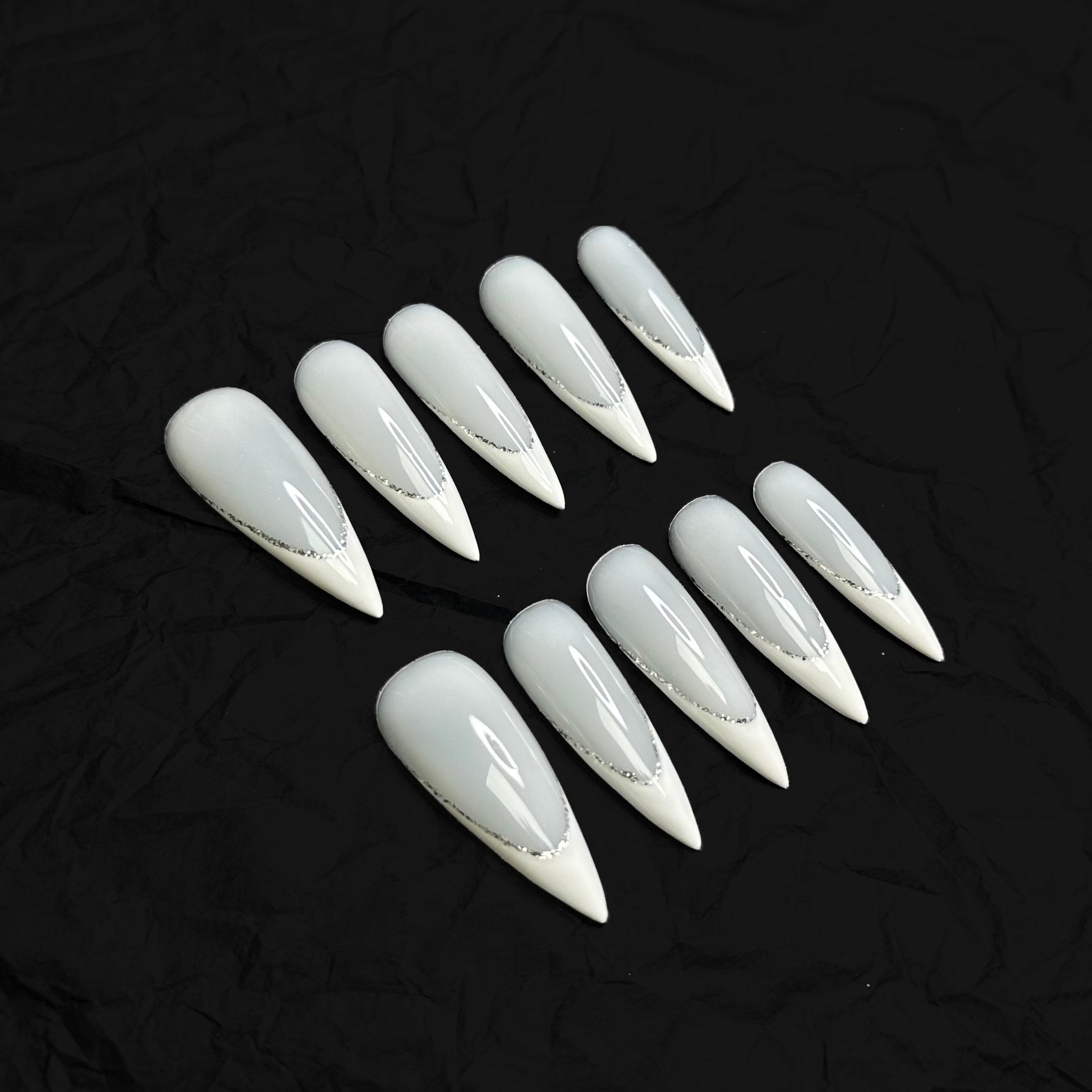 Design Concept: A modern twist on the classic French tip, this set features a seamless gradient from frosted white to crisp, pointed stiletto tips. The delicate silver lining adds a touch of refinement, creating an effortlessly chic and luxurious look. Perfect for those who love minimalism with a hint of glam.