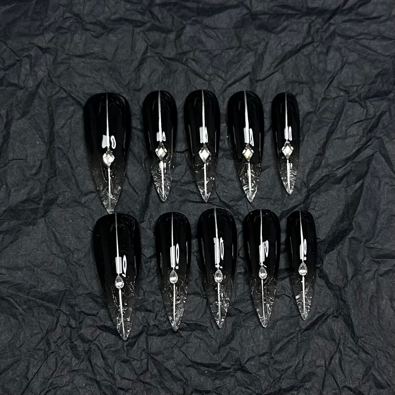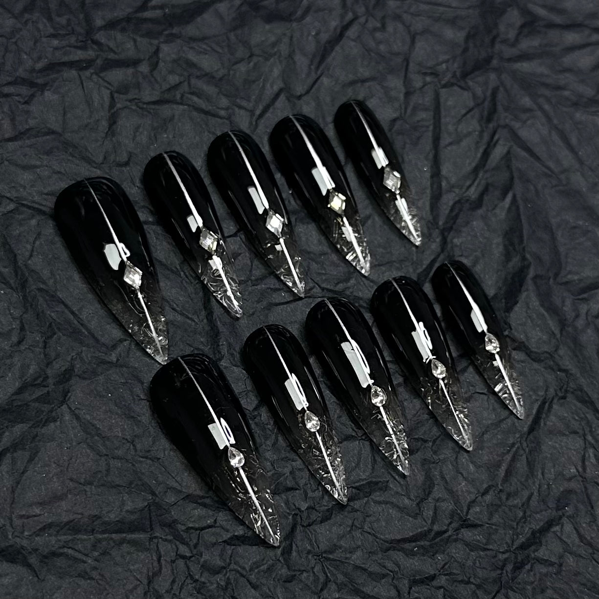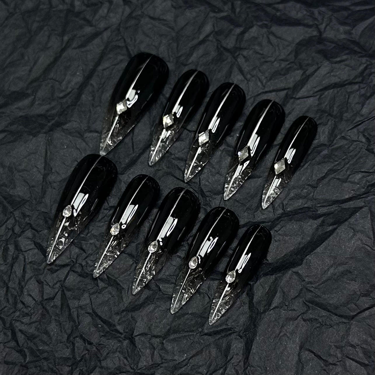 Design Story: Icy elegance with a bite. Crystal Fang features black gloss nails with sharp transparent tips, layered with ice-like textures and crystal gems—sleek, powerful, and wickedly refined.