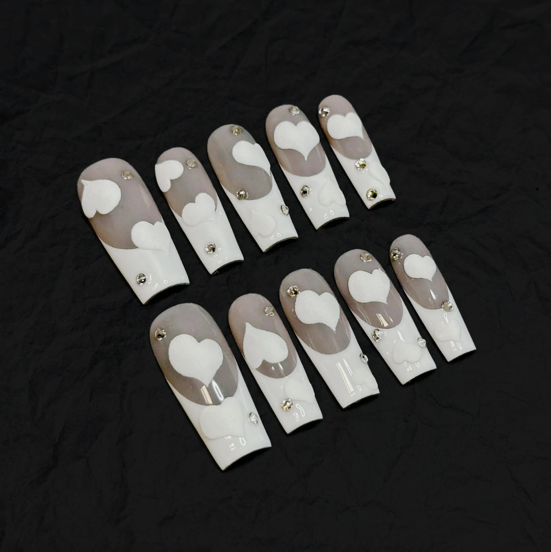 Design Story: A serene duet of soft grey and crisp white, Heartline Bliss captures the calm elegance of minimalist romance. The flowing yin-yang layout blends gently between the two tones, while raised velvet heart motifs and rhinestone accents add a playful touch of dimension and shimmer. Each piece is a gentle statement—subtle yet striking, calm yet charming. Perfect for anyone who loves love, in the most refined way.
