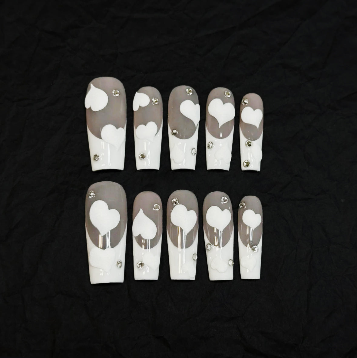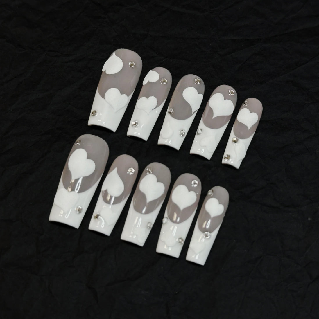 Press-on Set|Glossy Grey × 3D Hearts × Rhinestones