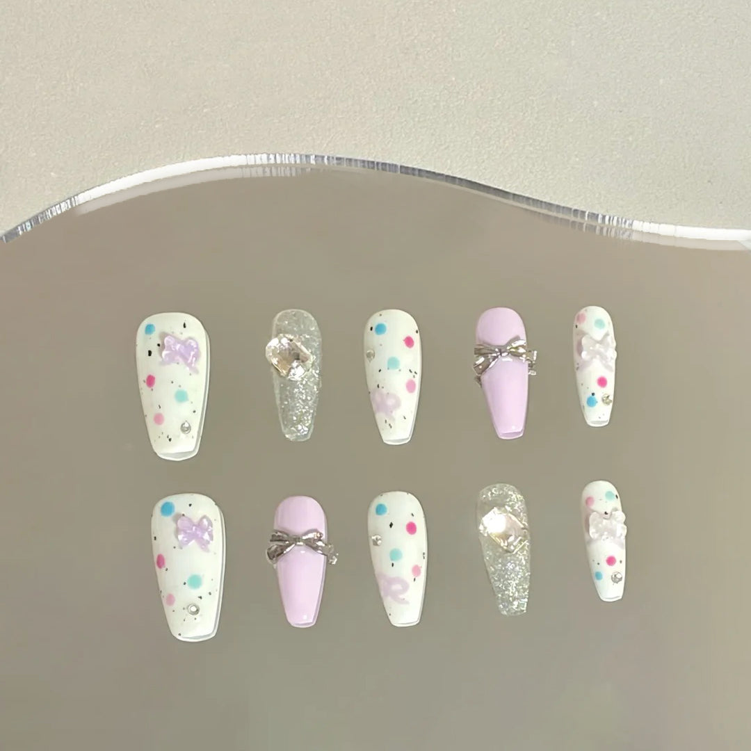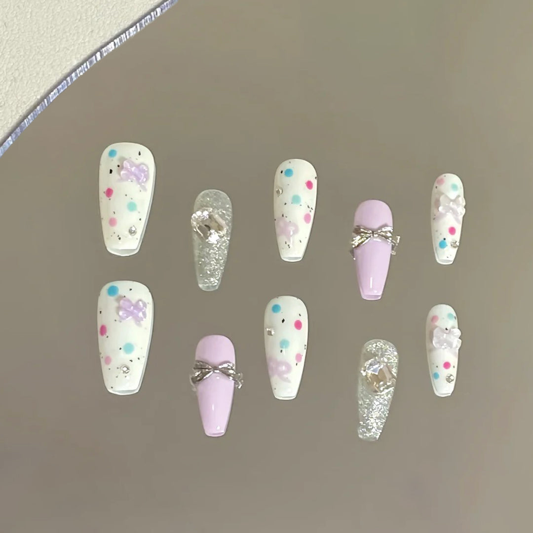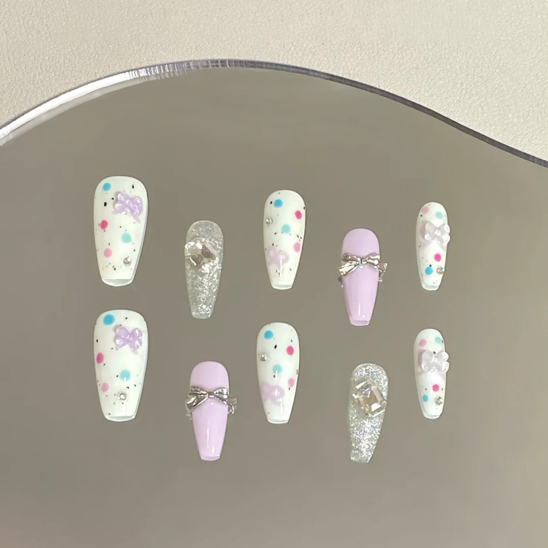 Design Story: Inspired by midsummer night fantasies, this set captures the magic of a starry night sky with a dreamy lavender, cream, and galactic silver palette. Playful dots, sugar bows, and stardust crystals create whimsical, enchanting designs that reflect the light of moonbeams and the twinkle of distant stars. Ombré transitions mimic the glow of twilight, while sparkling crystals refract like stardust, adding a touch of celestial magic.