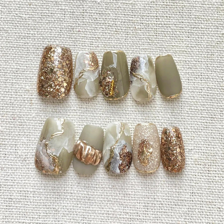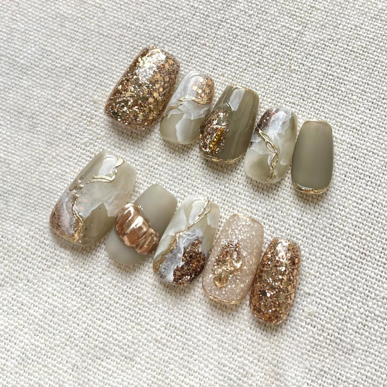 Press-on Set|Olive Quartz × Gold Veins × Rustic Glam