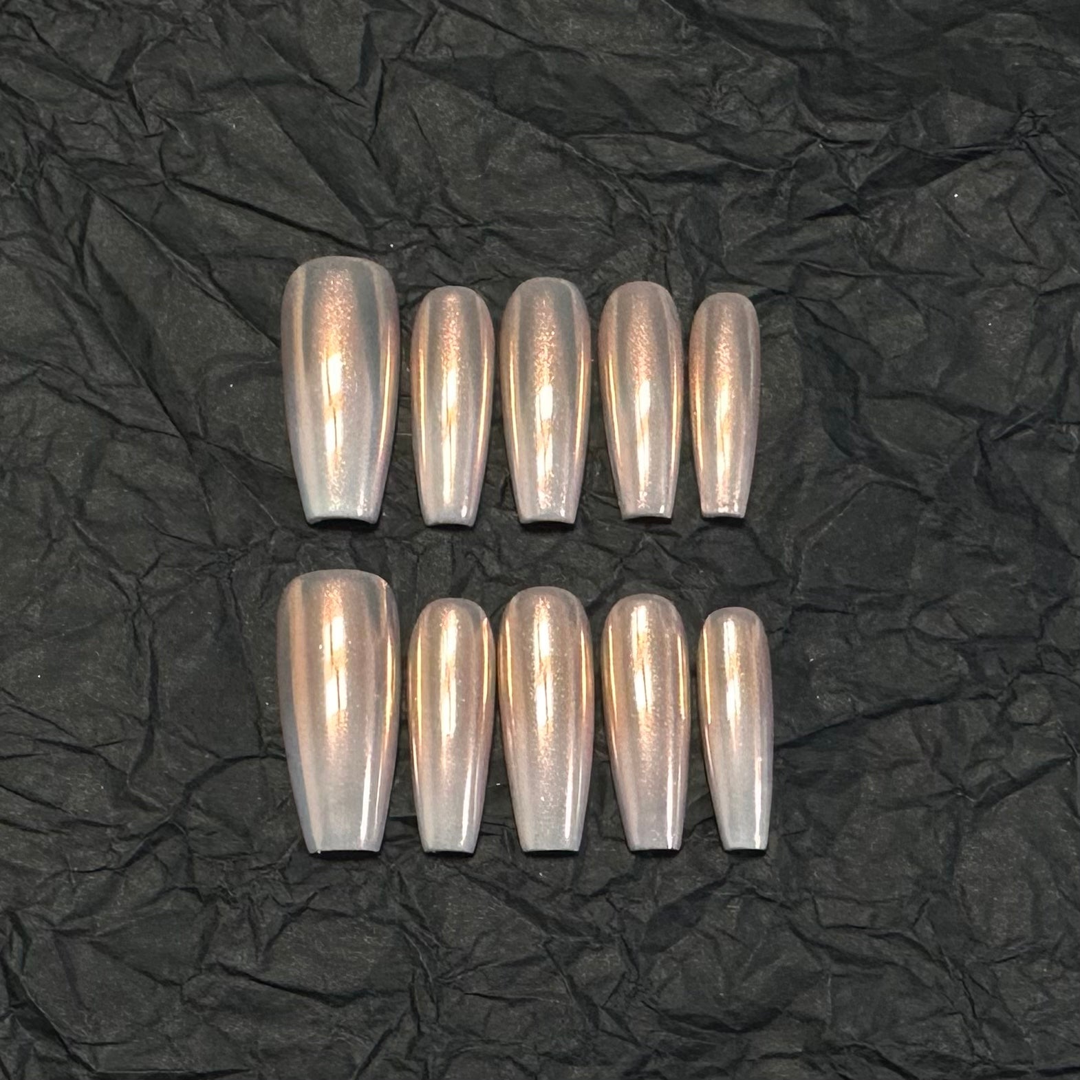 Design Story: Understated glow meets pearlescent grace. Shell Glaze is your go-to set for subtle elegance—barely-there shimmer in a champagne-pink veil, like seashell gloss under soft light.